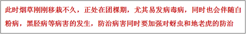 第二次用藥:太抗-幾丁30g+氟嗎啉*代森錳鋅30g+葉面肥25g兌水15kg噴霧煙株。(5月17日)